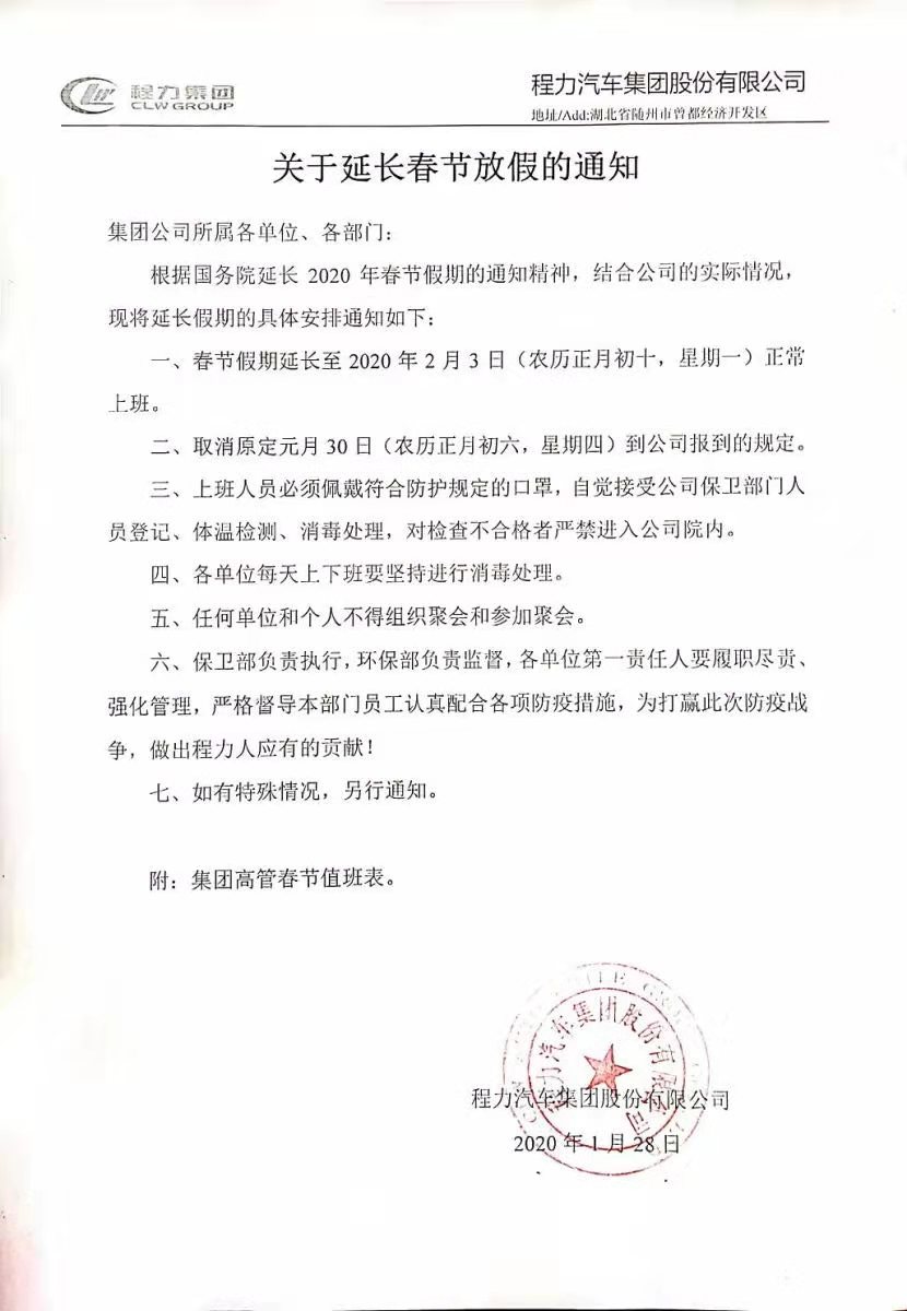 湖北程力汽車集團(tuán)關(guān)于延長(zhǎng)2020年春節(jié)放假通知