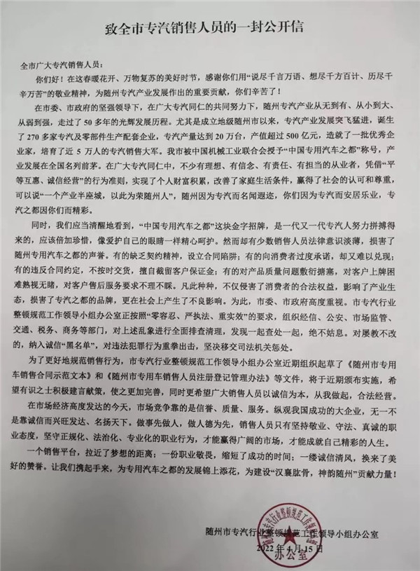 湖北隨州專汽銷售行業(yè)整頓公開信,誠(chéng)信為本從我做起合法經(jīng)營(yíng)
