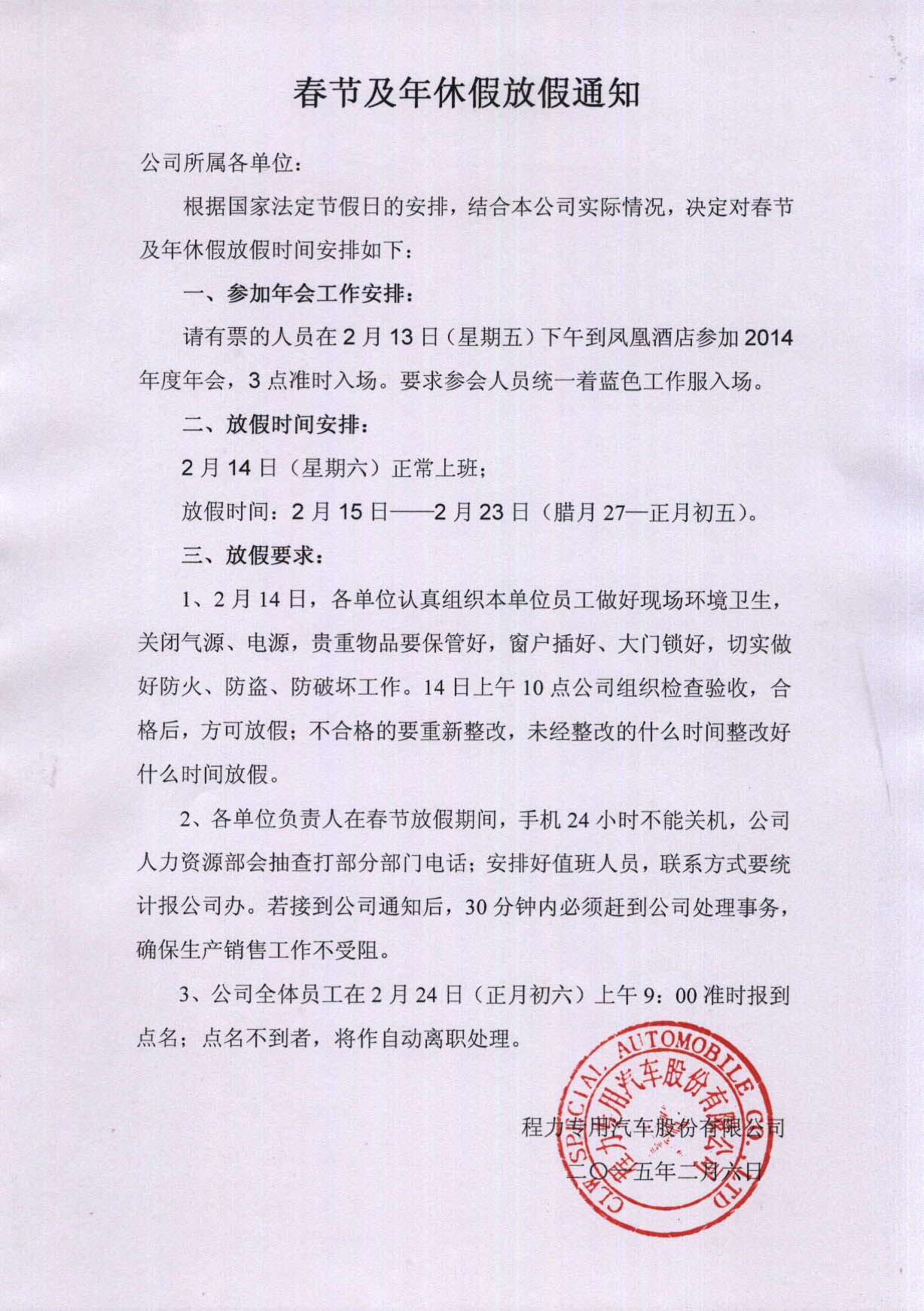 | 辭舊迎新的時刻就要來臨,湖北程力汽車銷售部感謝有你,坎坷的2014終于完美收官,讓我們一起迎接美好的 ️ ️ ️ ️!感謝那些一直支持丶幫助我的朋友們和同事,與其新老顧客們,在新的一年我將用更優質的服務回報您的支持與信任!新年到來之際祝所有朋友及其家人新的一年五羊 開泰,幸福安康、事業更上一層樓!在此祝新老顧客過個愉快的新春佳節,歡迎來電咨詢:0722-7029866.18672222488 2015年湖北程力春節公司放假安排如下: 一、公司定于2015年2月13日下午3:30準時到鳳凰大酒店參加2014年度工作總結表彰大會,暨2015新年團拜會,要求參會人員統一著裝藍色工作服入場,服從會場指揮人員的安排,遵守會場紀律。 二、公司定于2015年2月15日(臘月27)正式放假,2月24日(正月初六)上午9:00準時報到點名,點名不到者,將作自動離職處理。 三、2月15日(農歷臘月二十七),各單位認真組織本單位員工做好現場環境衛生,做到設備干凈無油污、無灰塵,安全通道暢通,地面衛生清潔整潔,電器電源關閉,貴重物品要保管好,鎖好車間大門,要做好防火、防盜、防破壞工作。公司組織檢查驗收合格后,方可放假。 四、各單位負責人在春節放假期間,手機24小時不能關機,安排好值班人員,聯系方式要統計。若接到公司通知后,30分鐘內必須趕到公司處理事務,確保生產銷售工作不受阻。 ![]() 放假期間,請大家一定要注意人身安全,并按時返回,如遇非人為原因無法按時返回,請及時向主管部門告假。最后衷心祝愿大家過個歡樂、祥和的春節,羊年年平安順利快樂健康!全家喜洋洋!!! |