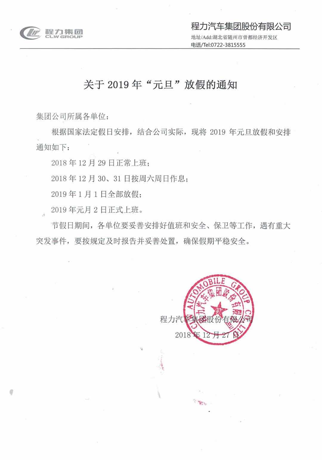 湖北程力汽車集團2019年元旦放假通知: