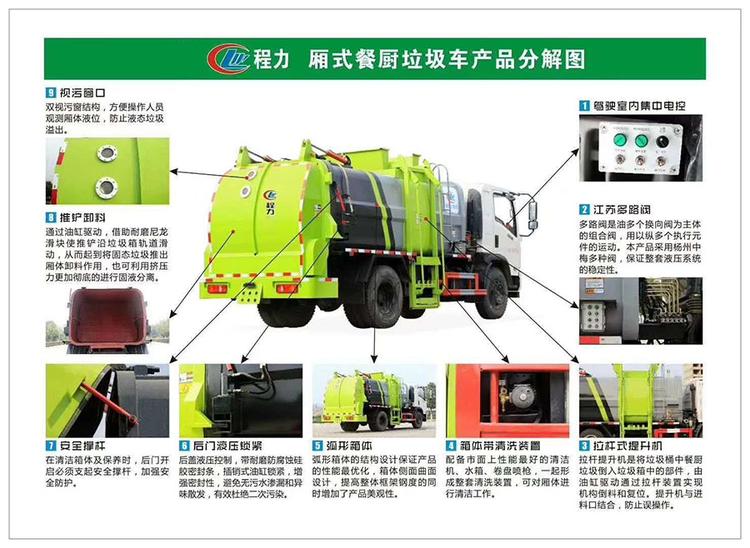 湖北程力國六東風天錦10-12方餐廚垃圾車(方罐)程力威牌CLW5160TCA6SL型餐廚垃圾車廠家配置: