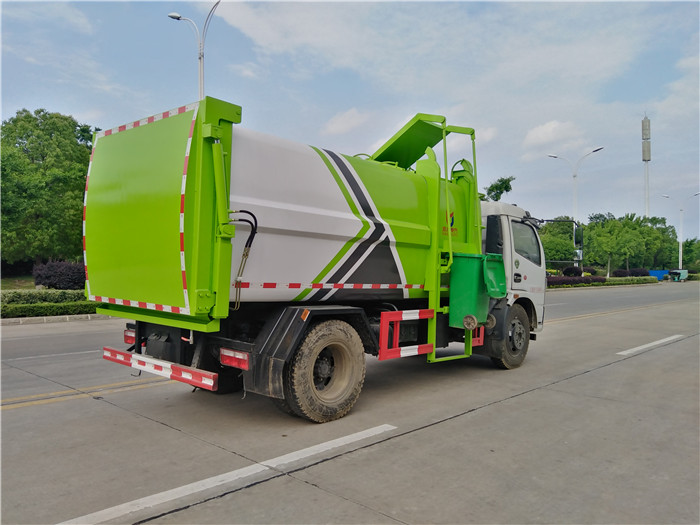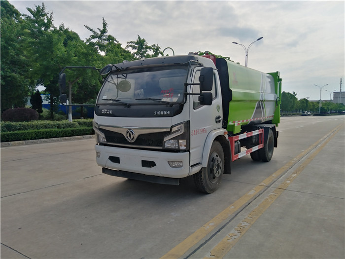 國六東風大多利卡側裝壓縮掛桶自裝卸式垃圾車箱體為圓弧形新型加強型,箱體容積7.5 立方,壓縮方式為液壓底推推板,提升機為機拉桿式,后門液壓反向鎖死,箱體材料為Q345B錳鋼制作,材料厚度為4個厚,液壓閥為中梅或長源牌,液壓缸為海普瑞斯,齒輪泵為合肥長源牌,箱體尾部加裝污水槽,可有效防止垃圾二次污染。