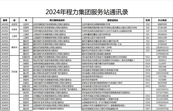 2、配件只收工本費,不加其他費用; 三、產品底盤故障,請按底盤廠家在就近服務站維修,具體地址詳見隨車發送的底盤服務站名錄或直接撥打電話查詢。 程力汽車公司竭誠為您服務。 24小時售后服務電話:0722-3816599 程力專用汽車股份有限公司(程力威)牌專用汽車全國服務站名錄如下: 程力汽車北京、天津、上海、重慶、河北、山西服務站通訊錄: