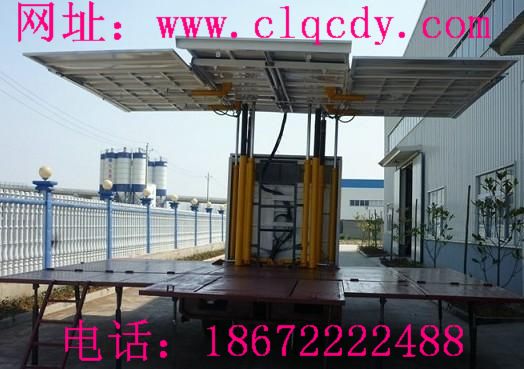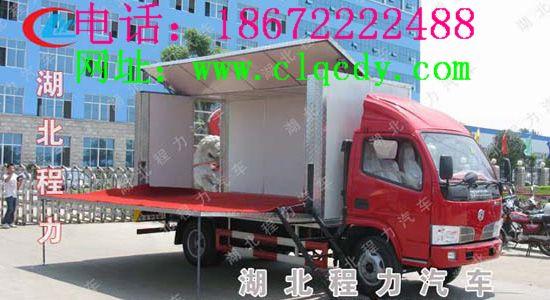流動(dòng)舞臺(tái)車(chē)的結(jié)構(gòu)功能說(shuō)明:流動(dòng)舞臺(tái)車(chē):通過(guò)機(jī)械裝置展開(kāi)、搭建成具有頂棚和舞臺(tái)版演出的舞臺(tái),并配備安裝舞臺(tái)燈光、音響等所需的專(zhuān)門(mén)裝置及電源接口等廂式專(zhuān)用車(chē)輛。 舞臺(tái)頂棚 :舞臺(tái)上方用于懸掛燈具、布景,并能遮擋風(fēng)雨和陽(yáng)光的結(jié)構(gòu)裝置。 頂廂板:車(chē)廂體的頂板,升起后作為舞臺(tái)頂棚的固定部分。 側(cè)廂板:廂體的側(cè)板,展開(kāi)或升起后做為舞臺(tái)的組成部分。廂體的側(cè)板,展開(kāi)或升起后做為舞臺(tái)的組成部分。 舞臺(tái)臺(tái)板:由支架和強(qiáng)化龍骨、竹夾地板構(gòu)成(耐磨降噪)適用于表演;安裝在整車(chē)車(chē)架或副車(chē)架上的支撐機(jī)構(gòu),演出時(shí)用于支撐舞臺(tái)車(chē)體,已形成一個(gè)無(wú)降沉、無(wú)晃動(dòng)、穩(wěn)定的基礎(chǔ)舞臺(tái)平面的裝置。 舞臺(tái)臺(tái)板滑道:配合活動(dòng)舞臺(tái)臺(tái)板展開(kāi)、收攏的滑道。 舞臺(tái)臺(tái)板支撐桿:用于支撐活動(dòng)舞臺(tái)臺(tái)板的機(jī)械裝置,能夠調(diào)節(jié)寬度。 燈光桿:布置于頂棚上,用于懸掛燈具的專(zhuān)用結(jié)構(gòu) 景物桿:布置于頂棚上,用于懸掛演出用布景等專(zhuān)用結(jié)構(gòu)。 電控箱:用于放置演出所需的配電設(shè)備及調(diào)光設(shè)備的控制箱。 舞臺(tái)臺(tái)口:靠近觀眾側(cè),舞臺(tái)臺(tái)板上表面與頂棚下表面的矩形區(qū)域。 舞臺(tái)凈高:舞臺(tái)臺(tái)板上表面與頂棚最低點(diǎn)之間的距離。 升降導(dǎo)向架:一種與車(chē)架或副車(chē)架固定聯(lián)結(jié),在垂直升降過(guò)程中可防止頂棚傾斜,在行駛及演出是對(duì)整車(chē)及舞臺(tái)起到穩(wěn)定作用的框架結(jié)構(gòu)。 廂體整體采用沖壓件組合骨架,外板為鋁合金平板,內(nèi)飾為防水膠合板,舞臺(tái)板為專(zhuān)用舞臺(tái)防滑板。 右側(cè)外板及頂板右側(cè)通過(guò)液壓舉升至與臺(tái)面垂直位置,形成遮陽(yáng)、擋雨、燈光固定的頂棚及廣告的承載面。 右側(cè)內(nèi)板(舞臺(tái)板)為兩折疊,通過(guò)液壓翻轉(zhuǎn)后作為舞臺(tái),舞臺(tái)左右加裝延展板,前面加裝T型臺(tái)。