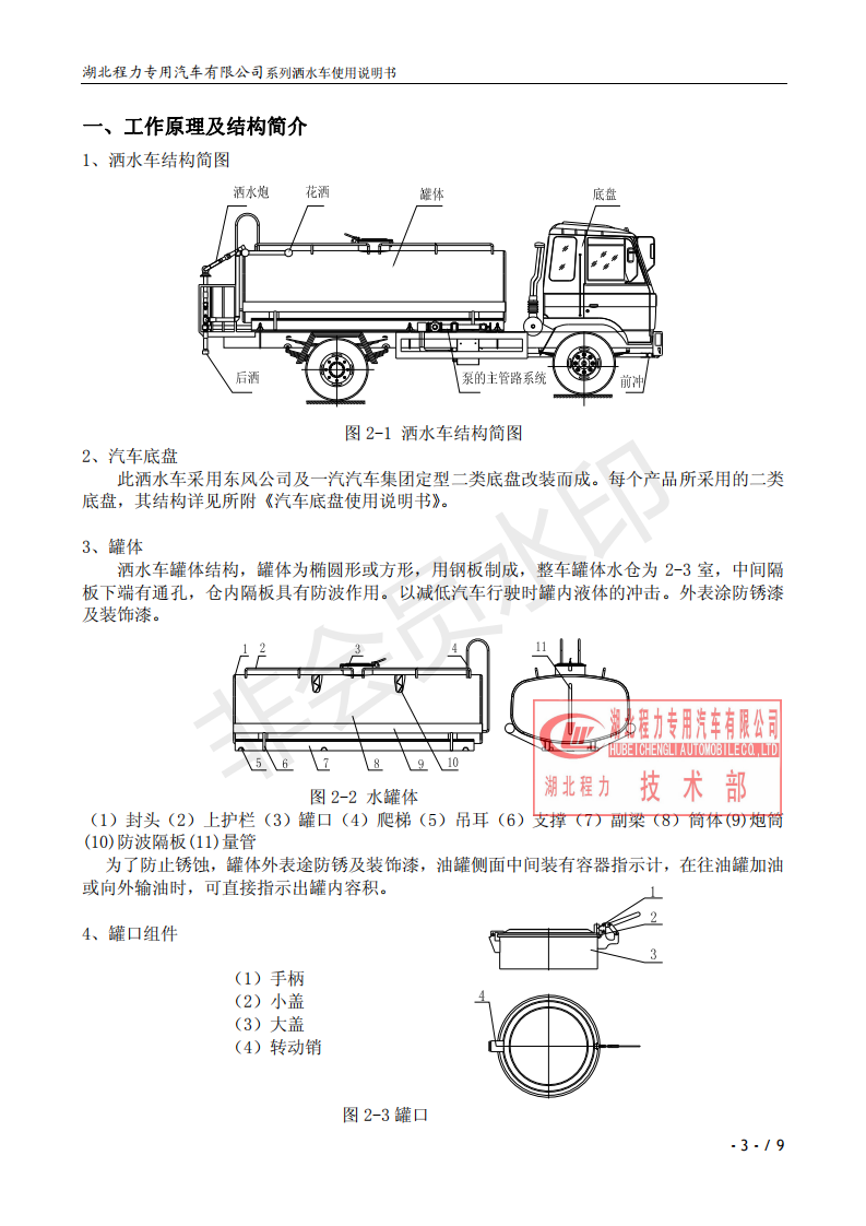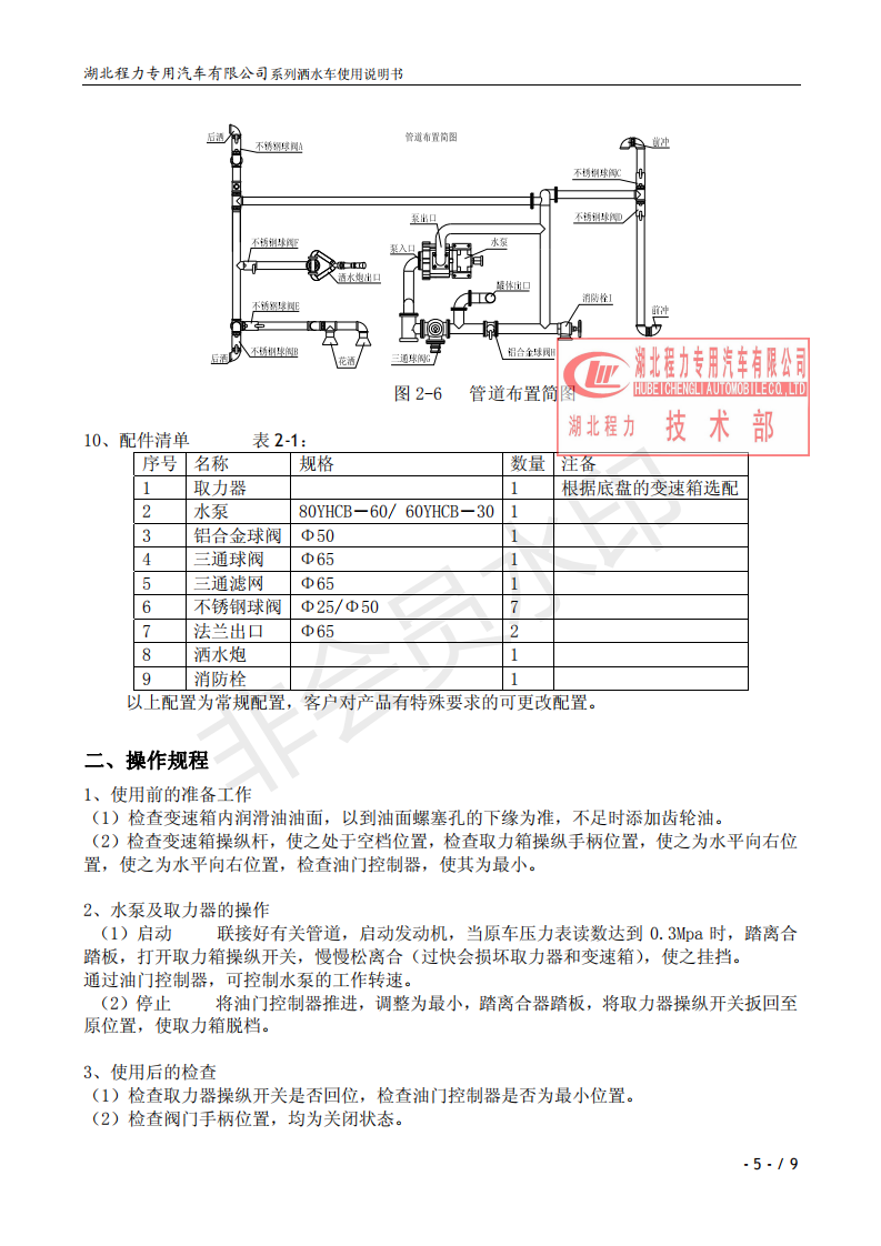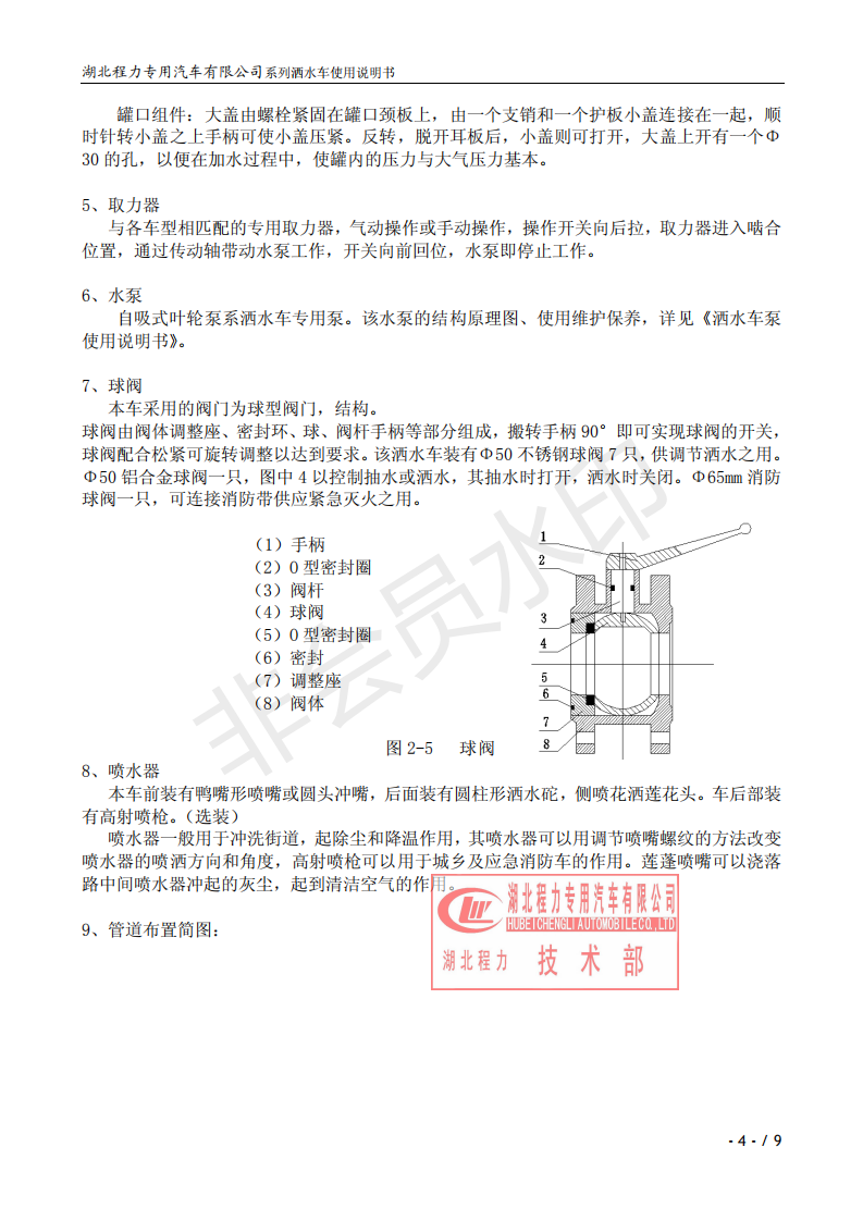 湖北程力專業生產東風小霸王灑水車、東風多利卡灑水車、東風灑水車、東風大金剛灑水車、東風140灑水車、東風140/47灑水車、東風145灑水車、東風153灑水車、東風1254灑水車、東風前四后八灑水車、東風天龍灑水車、半掛灑水車、解放系列灑水車、汽油灑水車等各類灑水車。用戶可自帶底盤我廠提供上裝部件的生產改裝。 灑水車前沖(噴)后灑,帶側噴,罐體后帶工作平臺,平臺上安裝綠化灑水炮,灑水炮可全方位旋轉,可連續調成直沖狀、大雨、小雨、毛毛雨,帶安全護欄,配備全國質量評比第一名的杭州威龍大功率專用灑水泵,泵可自吸自排,安裝過濾網,帶消防接口,可通過消防栓進水,帶自流閥,隨車選裝20米綠化卷盤,可噴灑農藥,罐體金屬漆。 灑水泵情況說明:大功率專用灑水泵,采用國際領先意大利技術,在國內生產各系列專用泵已有50年歷史,產品質量成熟可靠,設計先進合理,使用方便快捷,比同類灑水泵壓力大、吸程遠、使用壽命長,克服其它灑水泵易被雜物纏住、壓力小、吸水慢的缺點,引領國內外灑水泵行業標準,市場占有率93%。關于湖北程力灑水車使用說明書介紹如下,用戶不清楚可以直接打印出來。 ![]() ![]() ![]() ![]() ![]() ![]() ![]() ![]() ![]() |