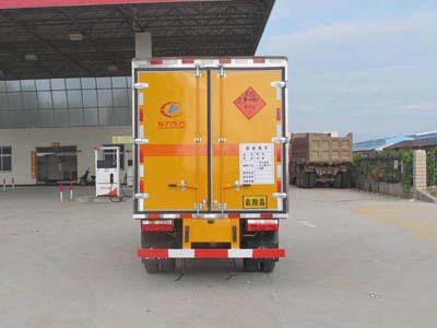 運輸品名:炸藥,雷管,類項號: 1.1D,1.1B。車廂頂部封閉,不可開啟,側防護為螺栓連接,后防護為焊接連接,后部防護裝置斷面尺寸(寬×高):50mm×100mm,離地高度為430mm.發動機型號為HFC4DA1-2C,對應油耗值為15.46.該車裝配具有衛星定位功能的汽車行駛記錄儀,該車裝配有限速裝置,此車僅選用子午線輪胎和裝有ABS的底盤 ,ABS型號:CM4YL,ABS生產企業:廣州市科密汽車制動技術開發有限公司;ABS型號:ABS 8.1 EA106,ABS生產企業: 博世汽車部件(蘇州)有限公司。