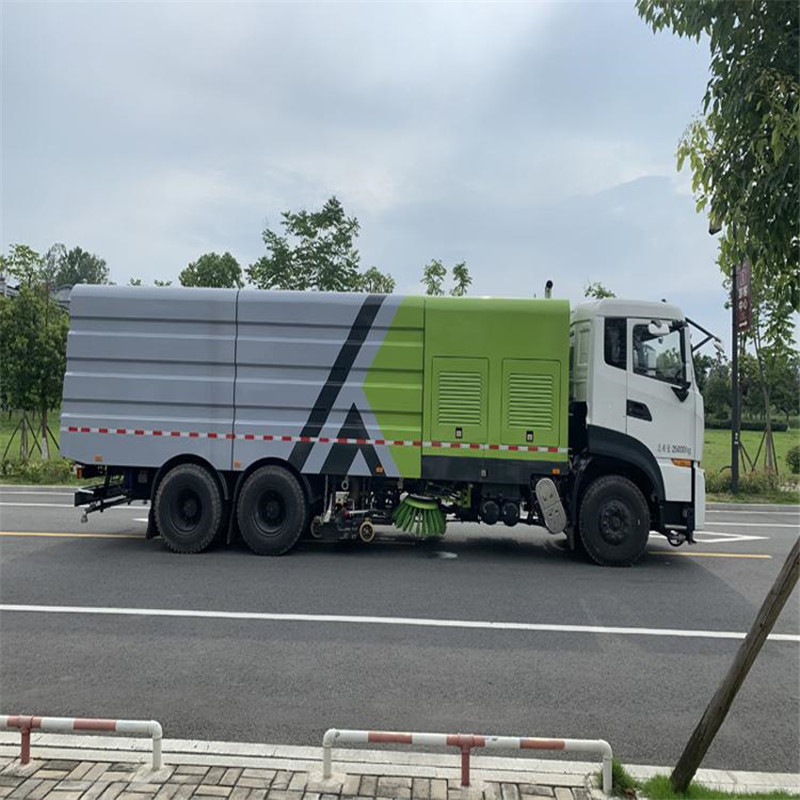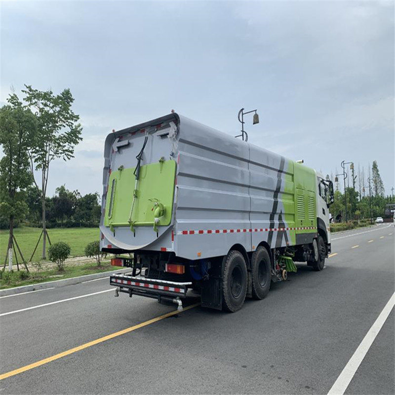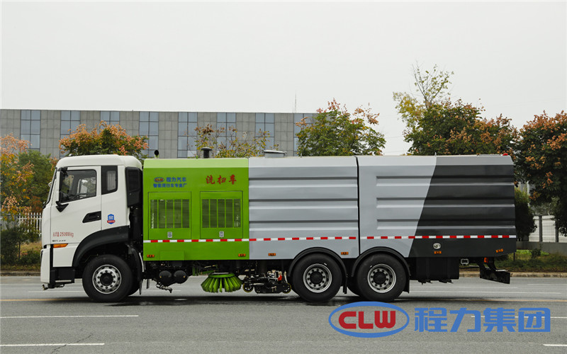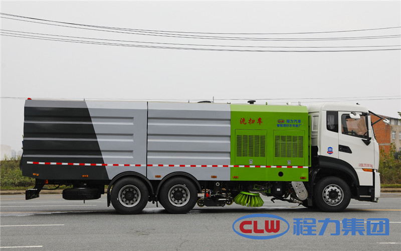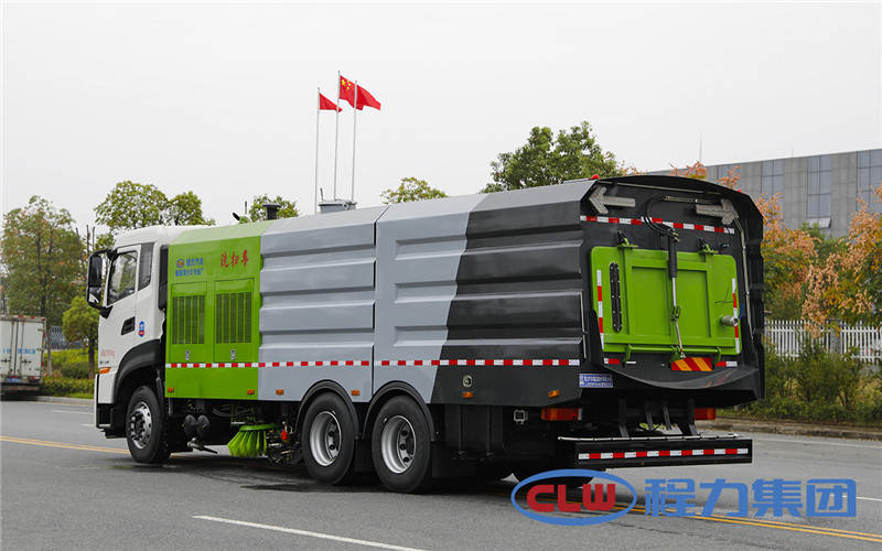 東風天龍洗掃車副發動機驅動風機和高壓水泵,副發動機采用東風康明期6缸柴油發動機。 風機用8.0高壓離心風機,效率高、風量大,最高風量達23500m3/h。 東風天龍洗掃車高壓水泵采用同際知名T7012IR 型柱塞柱,流量合適,壓力高,允許最高壓力達10MPa,清水箱充分利用了車載空間,容積大,容積達12m3。 東風天龍洗掃車垃圾箱采用單層不銹鋼結構,傾翻卸料,帶高壓位自潔裝置。自潔裝置可在垃圾箱卸料時幫助卸料,清洗垃圾箱內部。 東風天龍洗掃車左右立掃為單掃盤,減少了掃刷數量和掃刷消耗量,能降低使用成本。左右立掃分開控制,可實現左掃、右掃和全掃等不同作業模式。寬吸嘴的吸口寬度達到2418mm,確保作業總寬度大于3.5mm。 湖北程力國六東風天龍后雙橋大型洗掃4個高度可調的吸嘴輪,能方面調整和保證吸嘴與路面間的合理間隙。吸嘴內高有噴水桿,盡可能多地將高壓洗滌噴嘴布置在吸嘴內部,不但清洗效果好,還能最大限度減少高壓水氣流沖起污物產生的二次污染。左右噴水桿安裝在吸嘴上,隨吸嘴升降,結構簡單緊湊,保證噴水桿的離地高度固定不變,達到最佳清洗效果。 東風天龍洗掃車開式液壓系統驅動左右立掃升降、左右掃肋旋轉、吸嘴升降、垃圾箱后門開閉、垃圾箱傾翻復位等機械動作。底盤變速箱側取力器驅動低壓水泵,實現灑水車的低壓沖洗功能。一鍵式作業起動和停機操作。 東風天龍大型洗掃車具有路面清洗、路面清掃、路緣清洗、路緣和路緣石立面洗刷、低壓沖洗、噴霧除塵等多功能。有“全洗掃”、 “左洗掃”、 “右洗掃”、 “全掃”、 “左掃”、 “右掃”6種作業模式可選擇。選擇“全洗掃”模式清洗廣場和路面,清洗效率高效果好,洗凈率達90%以上。選擇“左洗掃”或“右洗掃”模式清洗路面和路緣、洗刷路緣石立面。需要進行路面清掃或路面保潔作業時,可選擇掃路模式。需要噴霧除塵時,可開啟噴霧裝置,進行噴霧除塵作業?梢韵駷⑺囈粯訉β访孢M行低壓沖洗作業。 東風天龍大型洗掃車適用于城市道路、高速公路、廣場、機場、碼頭、遂道、橋梁、隔離墻避、路緣和路緣石立面的機械化清洗、清掃、噴霧降塵等清潔作業。